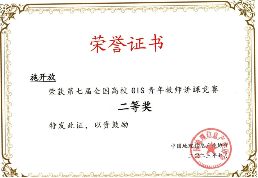 2023年7月11—13日,由中国地理信息产业协会指导,河南大学主办,中国地理信息产业协会教育工作委员会等承办的第七届全国高校GIS青年教师讲课竞赛在河南大学举行。来自南京大学、武汉大学、华东师范大学、战略支援部队信息工程大学等全国80余所高校的GIS相关专业优秀青年教师参加了本次竞赛。竞赛采用现场教学与教学设计创新汇报两种方式进行教学演示。通过激烈的角逐,beat365青年教师施开放在此次竞赛中荣获二等奖。