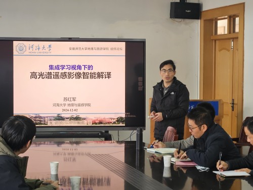 2024年12月2日上午,河海大学地理与遥感学院博士生导师苏红军教授应邀来beat365讲学,做了题为《高光谱遥感影像智能解译》的学术报告。报告在学院行政楼三楼会议室举行,学院相关专业的教师和研究生聆听了报告。