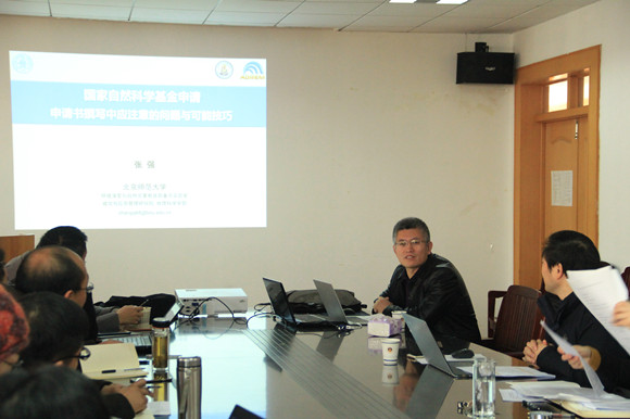 1月11日上午,校特聘教授、北师大张强教授,科研处自然科学管理科汪小丽老师应邀来beat365就2018年度国家自然科学基金项目申报工作进行交流指导。学院部分领导、符合基金申报条件的教师参加了申报辅导会。