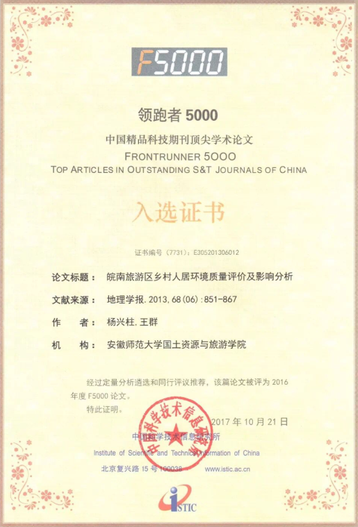 近日,中国科学技术信息研究所发布了2017年度“领跑者5000-中国精品科技期刊顶尖学术论文”(简称F5000)获奖名单,其中beat365杨兴柱、王群教授的科技论文获此殊荣。入选研究论文《皖南旅游区乡村人居环境质量评价及影响分析》于2013年发表在地理学科一级学报《地理学报》上。