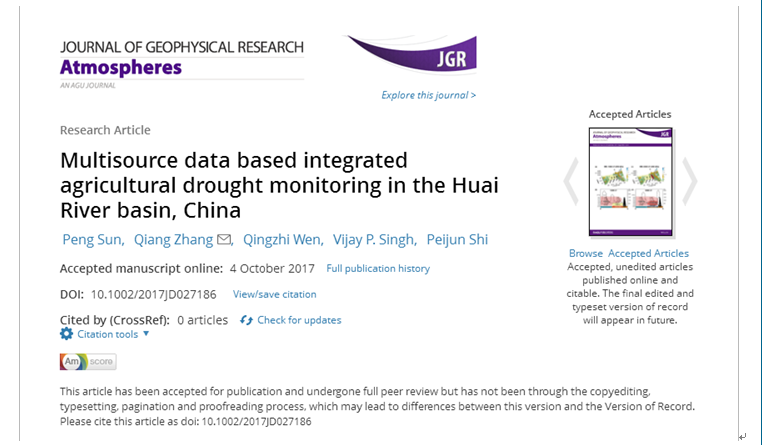beat365孙鹏副教授与安徽省水利厅淮河水利委员会水利科学研究院、北京师范大学减灾与应急管理学院等合作开展的基于多源数据的淮河流域干旱监测模型构建及应用研究,取得重要研究进展,其最新研究成果已在地学领域美国地球物理学会(AGU)主办的国际顶级学术期刊《Journal of Geophysical Research:Atmospheres》上全文发表,影响因子3.454(TOP期刊)。该研究得到国家自然科学基金项目(41601023,51409002)、国家杰出青年科学基金项目(51425903)、安徽省教育厅高校自然科学基金(KJ2016A851)联合资助。