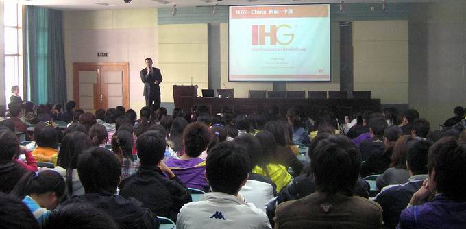丁总经理利用生动的视频展示了洲际集团一百多年的发展历程。他的报告分为三个部分:一是洲际集团的使命、集团的战略以及致胜之道和他自己的职业生涯规划。二是洲际集团的概况。该集团目前已成为全球最大、拥有客房数最多的酒店管理公司,旗下拥有洲际酒店、皇冠假日酒店、假日酒店、假日快捷酒店、Staybridge Suites、Candlewood Suites和Hotel Indigo等七大品牌。三是洲际集团在中国的发展现状及未来的发展趋势。1984年“洲际”进入中国,成立了第一家酒店——北京丽都假日酒店,目前已发展到126家,拥有四个品牌。他预言未来三年内洲际将会为中国提供200多个总经理、3000多个部门经理和70000多名员工的就业机会。