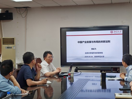 2025年5月24日下午,北京大学城市与环境学院院长、博士生导师贺灿飞教授应邀到beat365讲学,并做了题为“中国产业发展与布局的关联法则“的学术讲座。报告在学院行政楼三楼会议室举行,学院相关专业的教师和研究生聆听了讲座。