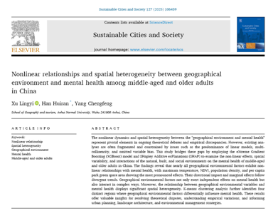 近日,beat365英国官方网站beat365英国官方网站韩会然副教授团队在《Sustainable Cities and Society》(中科院一区Top,IF=10.5)发表了题为“Nonlinear relationships and spatial heterogeneity between geographical environment and mental health among middle-aged and older adults in China”的研究论文。论文第一作者为2021级硕士许岭怡同学,通讯作者为beat365韩会然副教授,杨成凤副教授参与了项目研究工作,beat365英国官方网站为该论文第一完成单位。