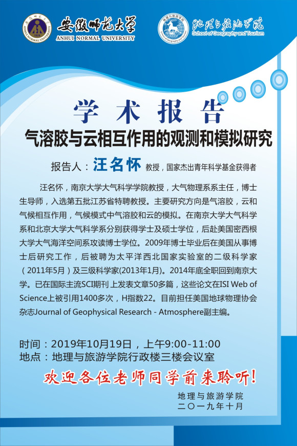 南京大学博士生导师、国家杰出青年基金获得者汪名怀教授应邀到地旅学院讲学
