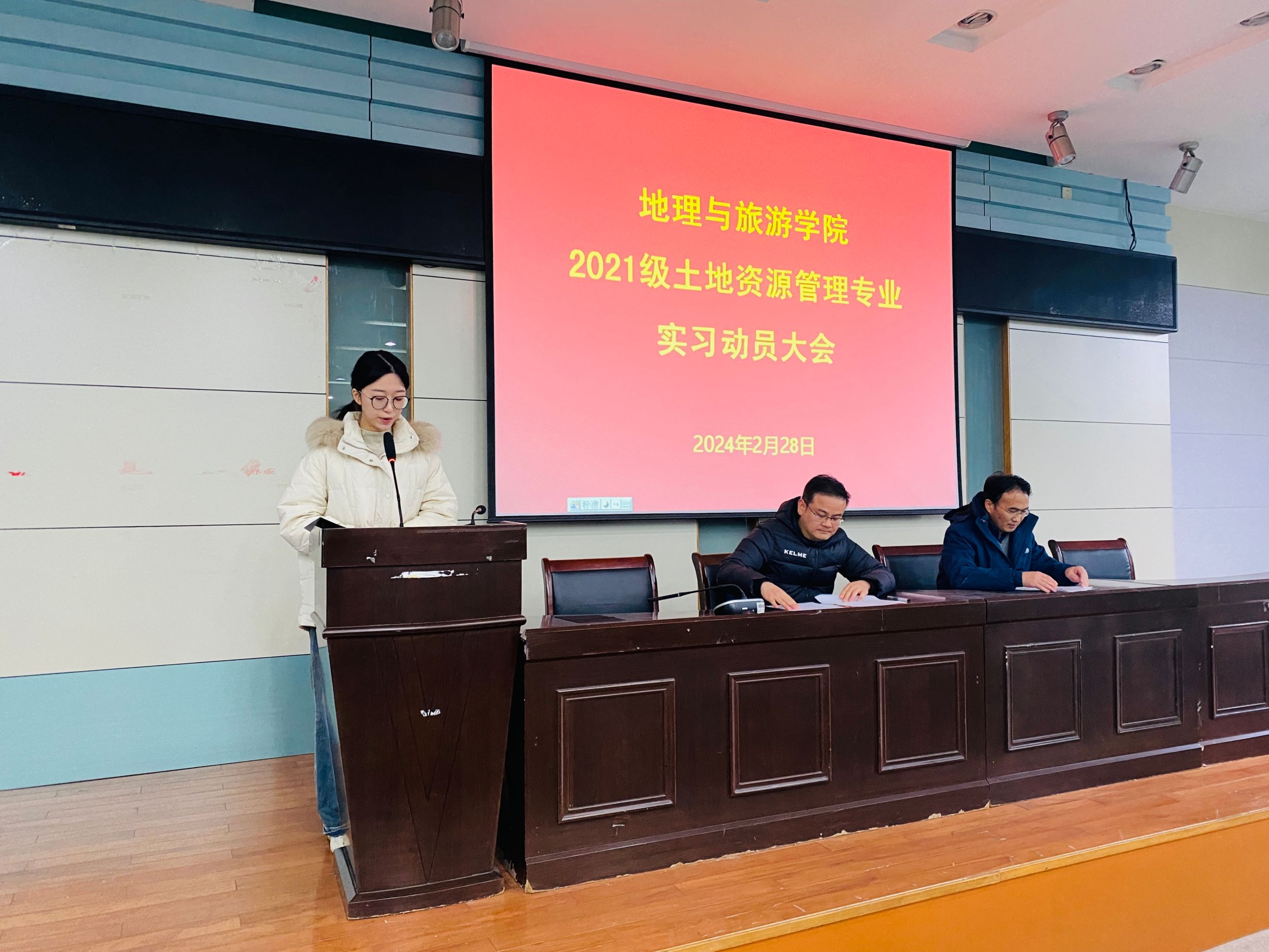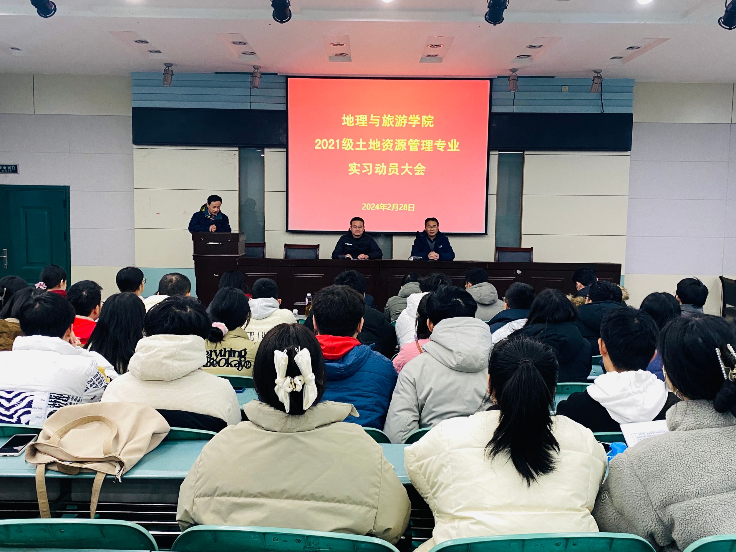 2月28日下午,2021级土地资源管理专业实习动员大会于地旅学院101报告厅召开,学院党委副书记付勇、副院长杨兴柱、土地资源管理专业负责人费罗成、全体实习指导老师、辅导员吴文涵及2021级土地资源管理专业全体学生参会,会议由实习秘书张运主持。