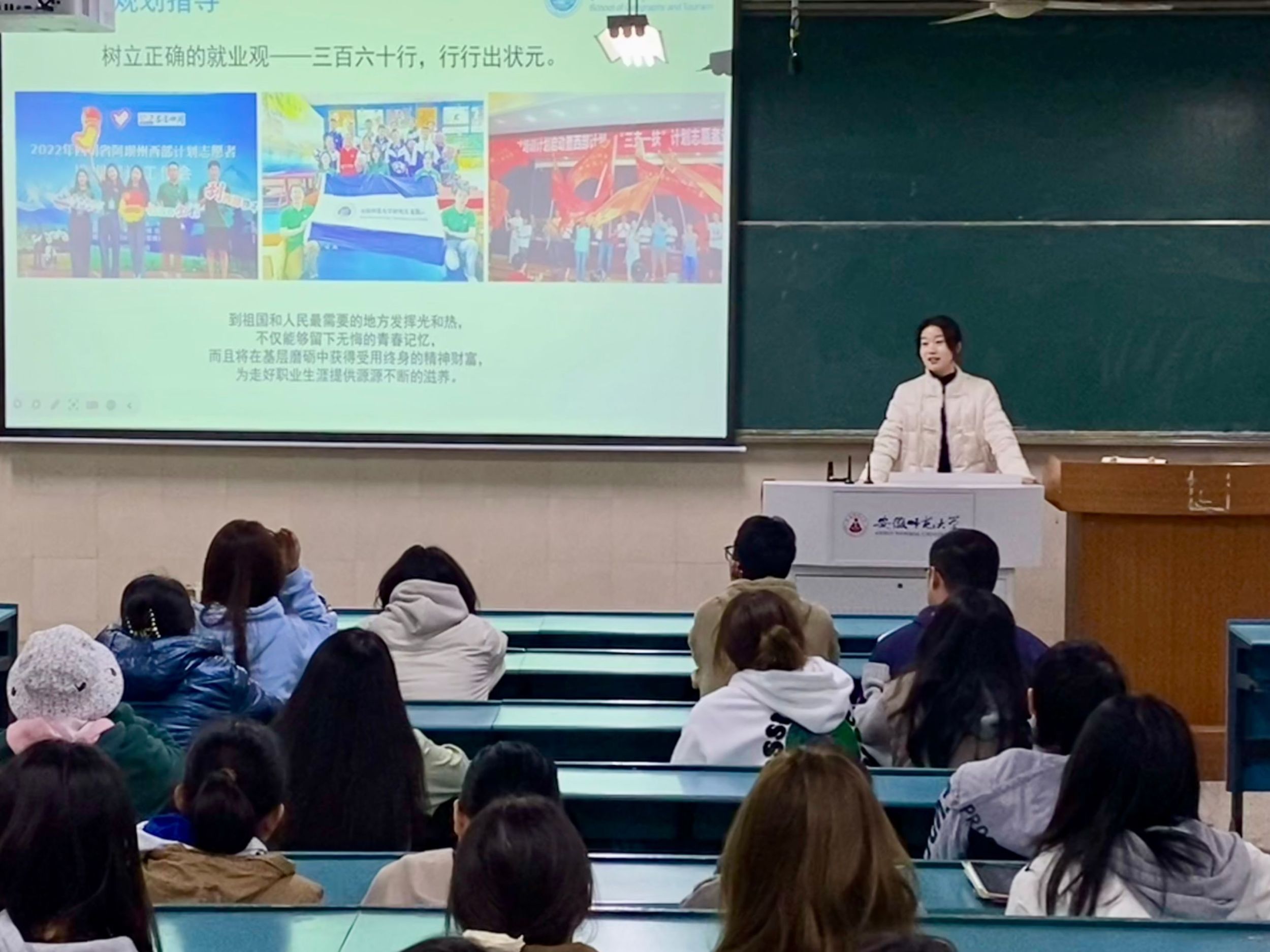 会上,谢老师分享了往年优秀毕业生鲍格格、褚超群的成长经历,并跟同学们分享了考证经验。“凡事预则立,不预则废。大家的就业观念要贯彻整个大学四年当中,认真踏实做好每一件事情,以高质量就业为目标导向,努力提高个人综合素质。”谢老师如上总结。