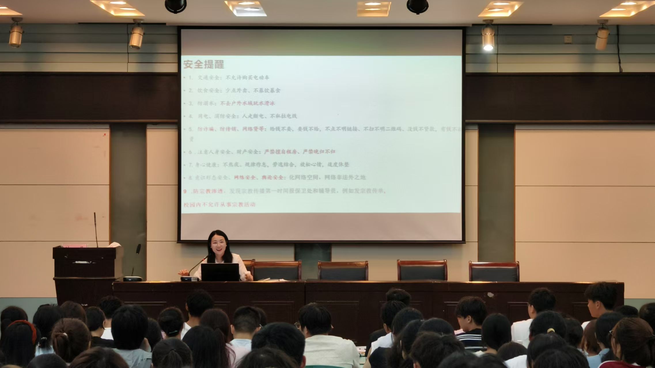 会议最后,彭媛媛再次校园安全的重要性,详细向同学们解读了“四项禁令”和“八个严禁”,从人身财产安全、消防安全、用电安全、交通安全、防溺水、防诈骗、网络舆论安全等方面作出安全提醒,为同学们能够开启轻松愉悦的新生活保驾护航。千里之堤溃于蚁穴,希望同学们要能在校园安全方面防患于未然,远离纪律红线,牢记安全底线,共筑生命防线。