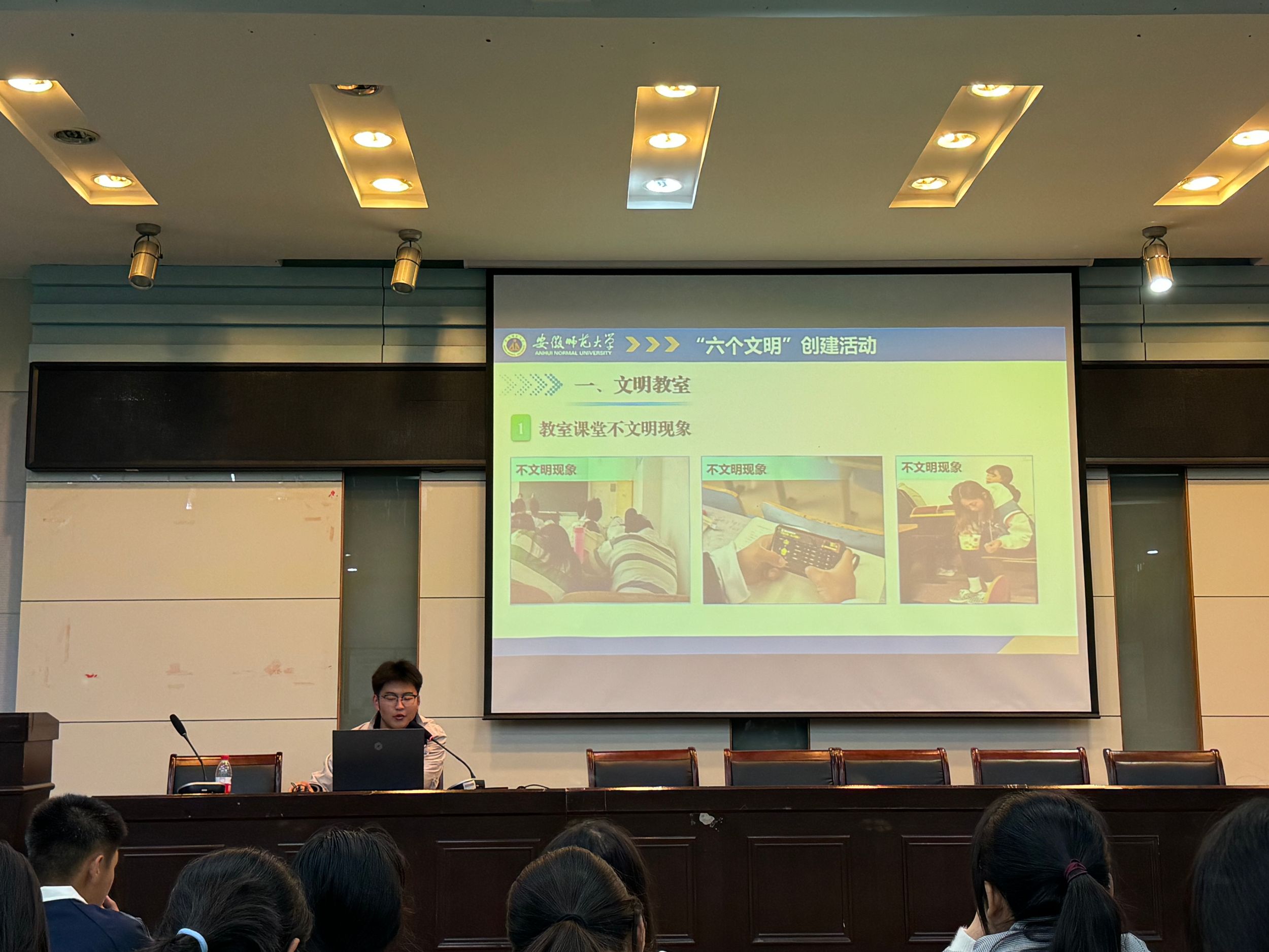 沈涵重点介绍了《beat365英国官方网站关于开展大学生“六个文明”教育实践活动的实施方案》及《深化大学生“六个文明”教育实践专项活动方案》,包括文明教室、文明宿舍、文明就餐、文明交通、文明交往、文明上网六个教育实践专项活动并着重强调了遵守校规校纪的重要性。沈涵说道,全体同学要以“主人翁”的意识持之以恒地努力付出,不断增强思想自觉,充分认识到培养文明习惯和修身意识对同学们成长成才的重要意义。