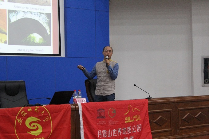 活动在丹霞山的宣传片中开始,视觉与听觉的在冲击激起了同学们的兴致。随后,吴立开始了主题为《中国丹霞地貌的探索历程》的科普讲座。他首先从丹霞地貌的定义出发,用生动的语言介绍了丹霞地貌,并通过世界各地丹霞地貌的图片展示,让在座的同学感受到了大自然的鬼斧神工。紧接着他介绍了丹霞地貌的研究简介及中国丹霞申遗历程与意义,并指出丹霞地貌学是中国学者对世界地学的贡献。除此之外,他还讲述了丹霞的保护利用与可持续发展以及丹霞地貌与彩色丘陵、喀斯特地貌的区别。互动环节中,现场同学们积极主动发言提问,吴立热情的与同学们交流,耐心答疑。