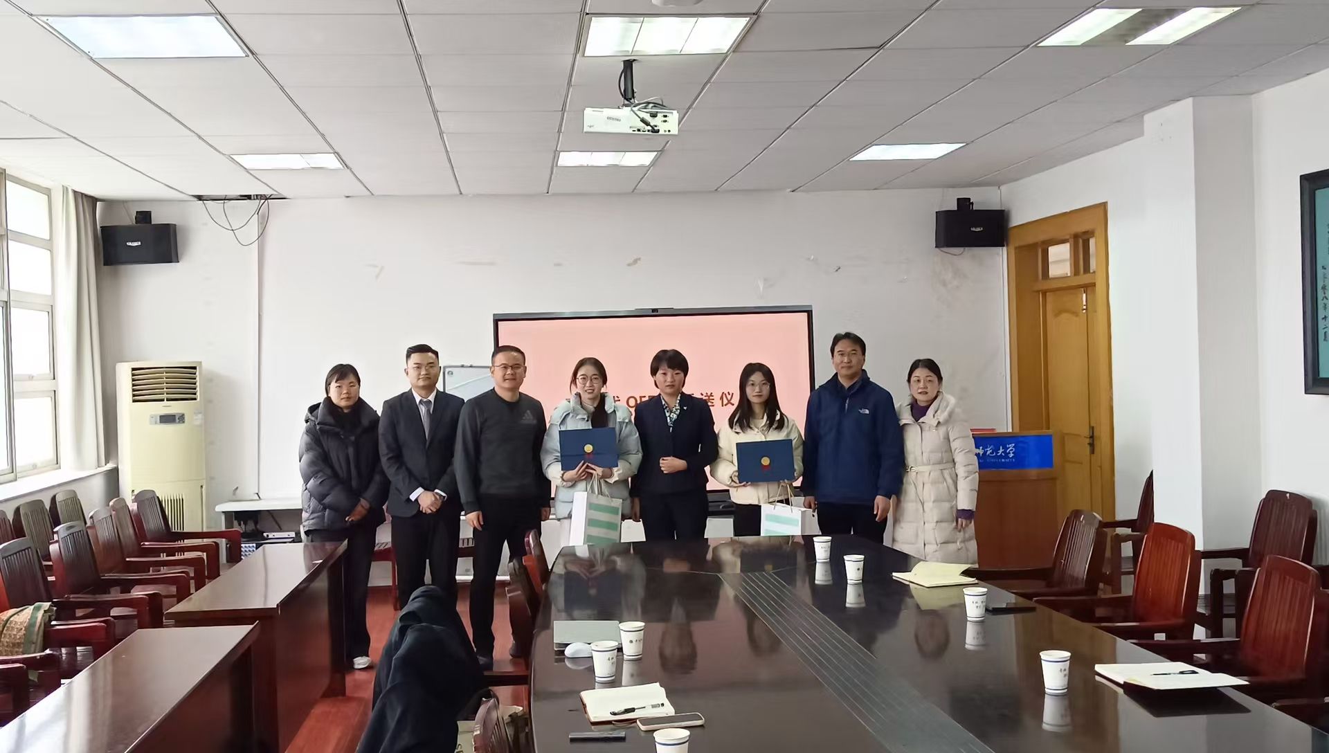 会议现场举行了毕业生现场签约仪式,吴燕为两名即将毕业的旅游管理专业同学颁发开元森泊管培生的offer。