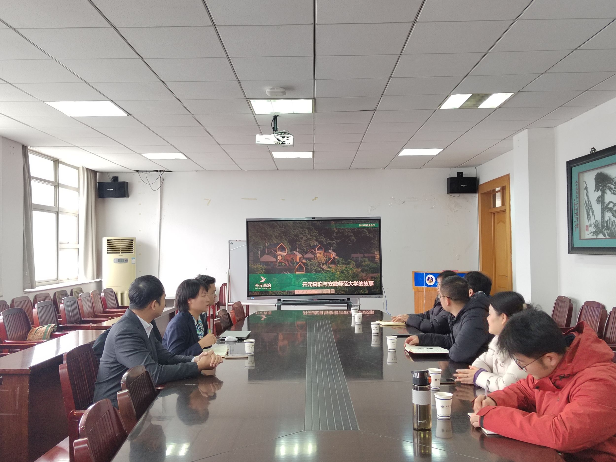 付勇对吴燕一行的到来表示诚挚欢迎,对开元森泊一直以来对学院的实习、就业给予的支持表示感谢。他简要介绍了学院的基本情况和发展态势,并希望双方能够进一步加强合作,共同培养出更多优秀的管理人才,为社会和行业的发展贡献力量。吴燕回顾了开元森泊和地旅学院合作历程。2018年起,地旅学院学生赴开元酒店及森泊度假区实习。2020年,双方共创服务设计院校赛,至今已举办四届,同年开元森泊启动“带你出道”大赛,连续四年地旅学院积极组织参与,以赛促学,让更多旅游管理专业同学加深对行业的了解。2023年,安师大与开元森泊合办院校职业经理人计划,助力更多学生清晰全面的了解旅游行业发展。