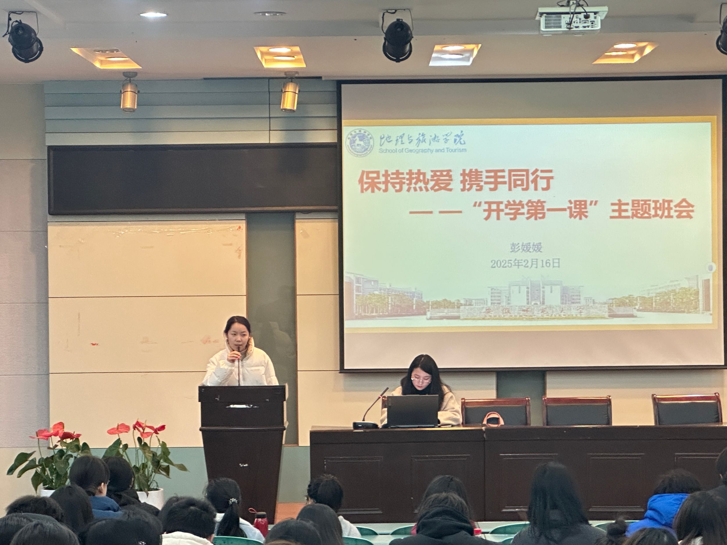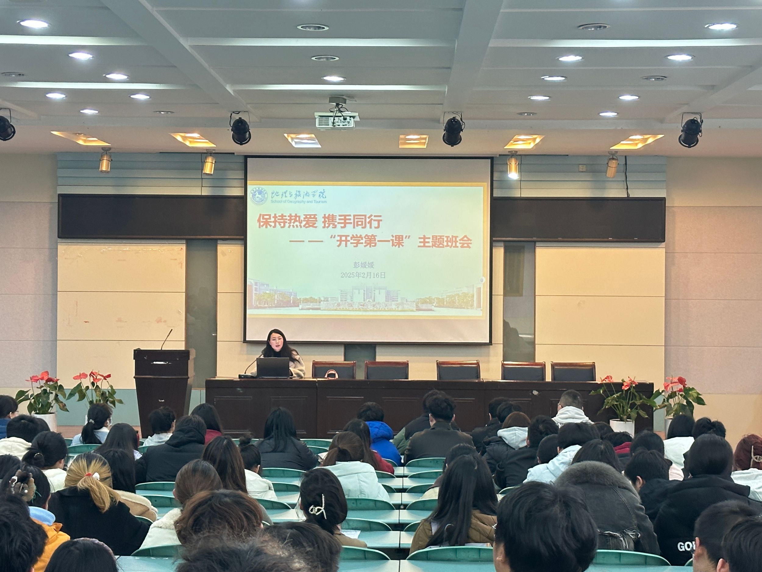 (地旅学院 曹文瑾、何诗雨)2月16日下午,2024级地理科学(师范)、城乡规划、土地资源管理专业在beat365英国官方网站实验楼101报告厅召开以“保持热爱,携手同行”为主题的开学第一课主题班会。会议由辅导员彭媛媛主持,全体学生参加。