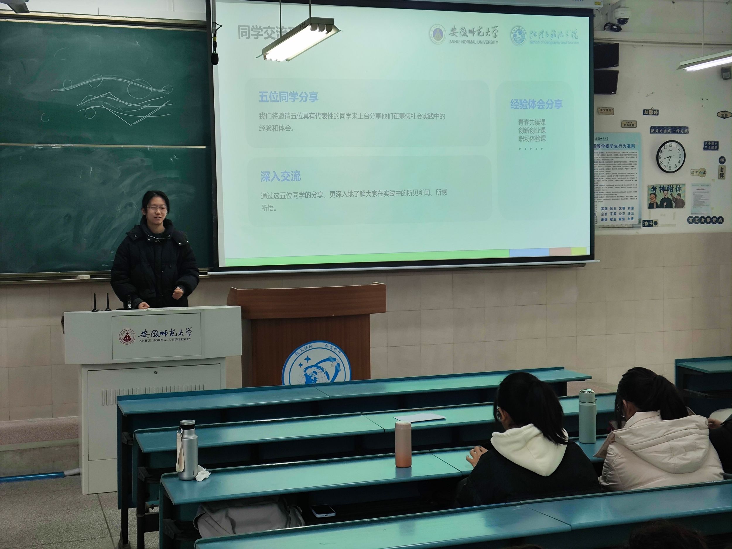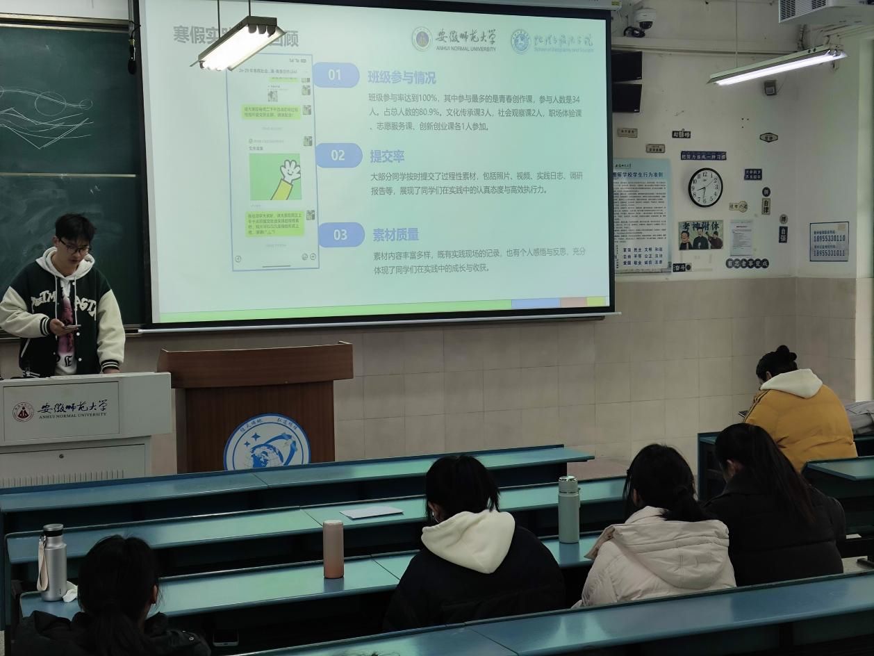 据分享会介绍,寒假期间全班同学参与率达100%,累计提交超110份实践素材,涵盖志愿服务、职场体验、社会观察、创新创业等多个领域。其中,“青春创作课”以34人参与的热度成为最受欢迎实践课程。活动现场展示了丰富的照片、视频、调研报告及实践日志,生动记录了同学们在岗位实习、文化传承、科研探索中的点滴成长。