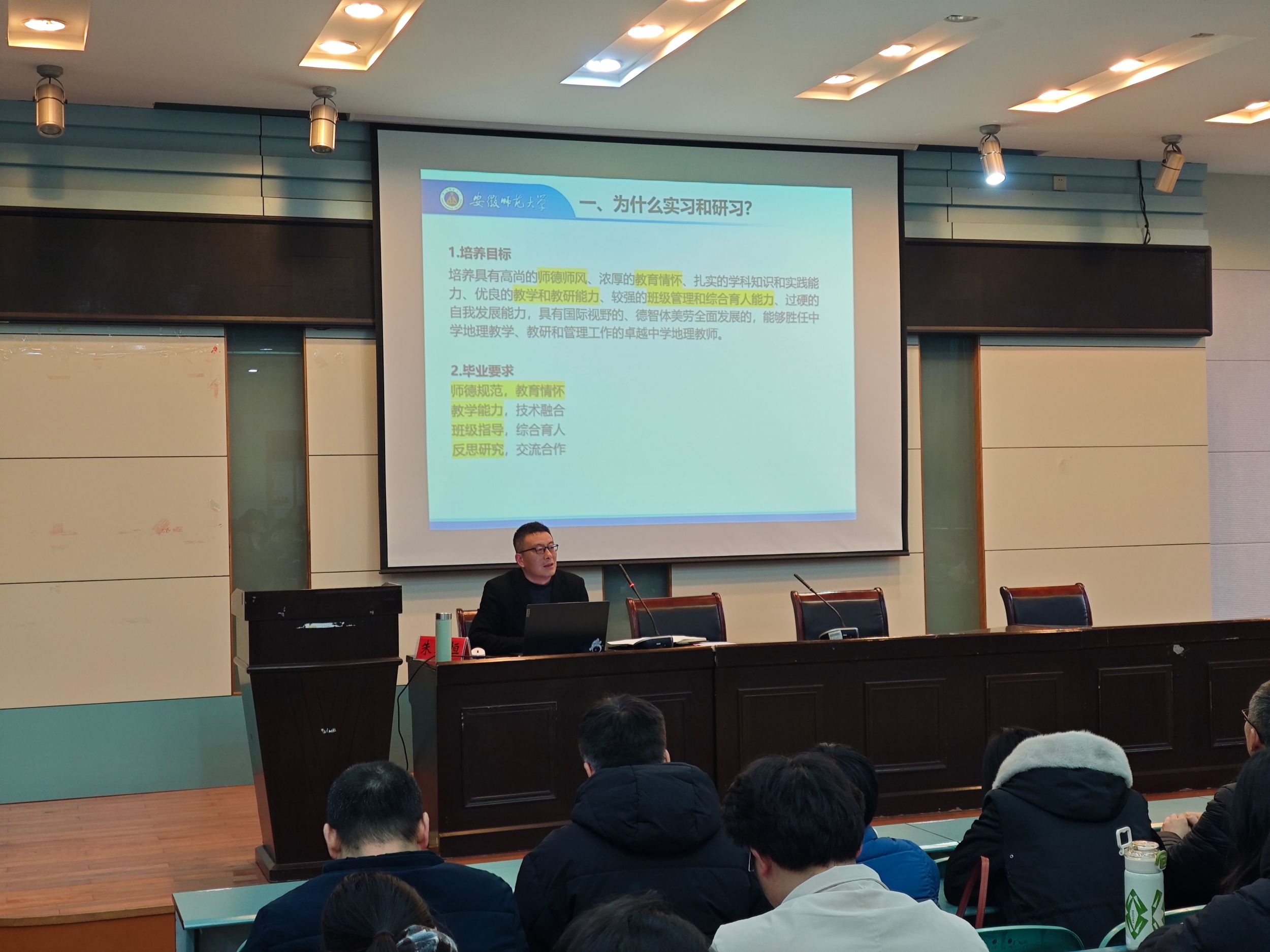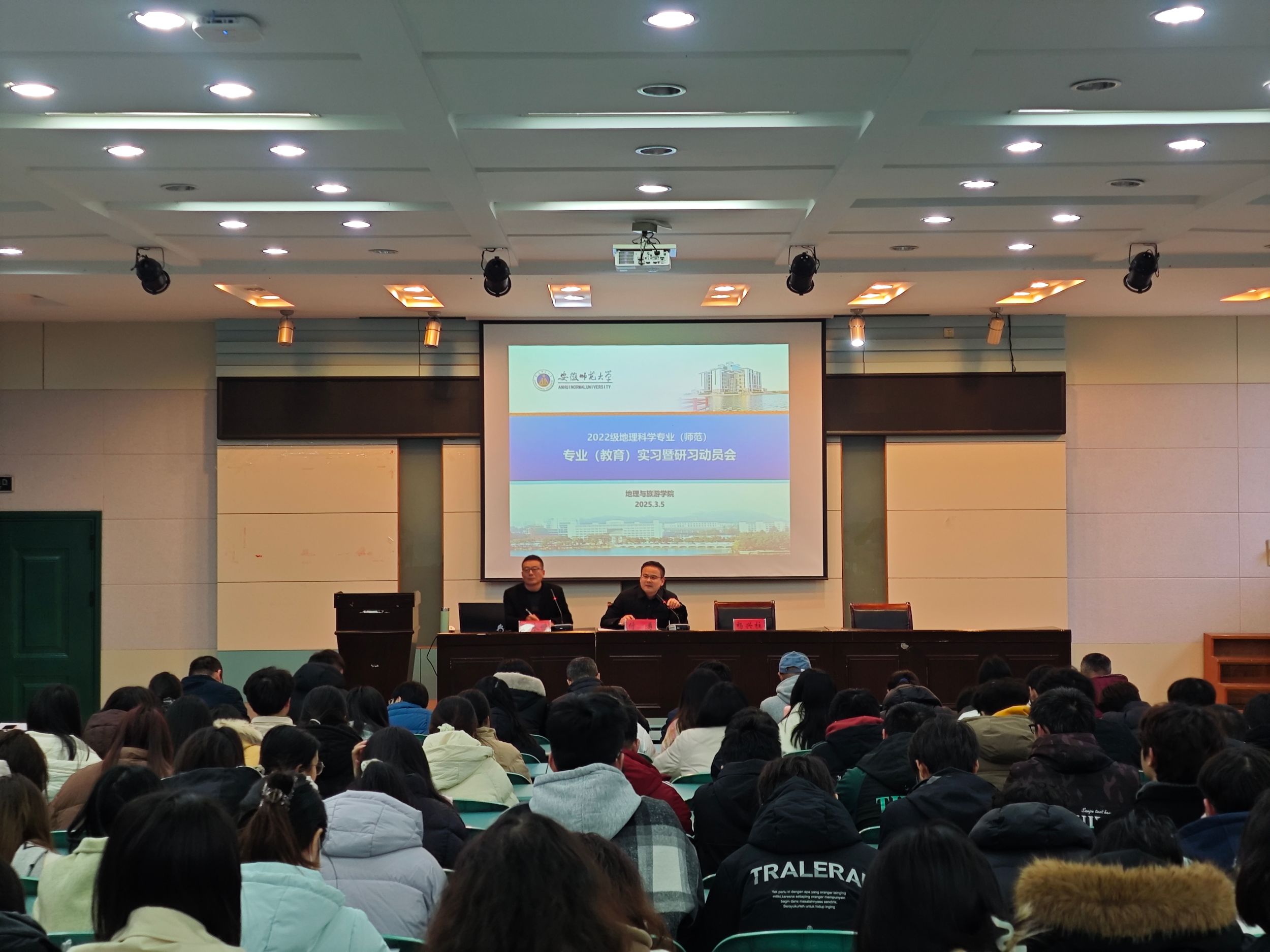 2025年3月5日,2022级地理科学(师范)专业在beat365英国官方网站实验楼101报告厅召开教育实习动员大会。会议由地理科学专业负责人朱永恒主持,地旅学院党委副书记付勇、教育实习全体指导老师、辅导员及2022级地理科学(师范)专业全体学生参加会议。