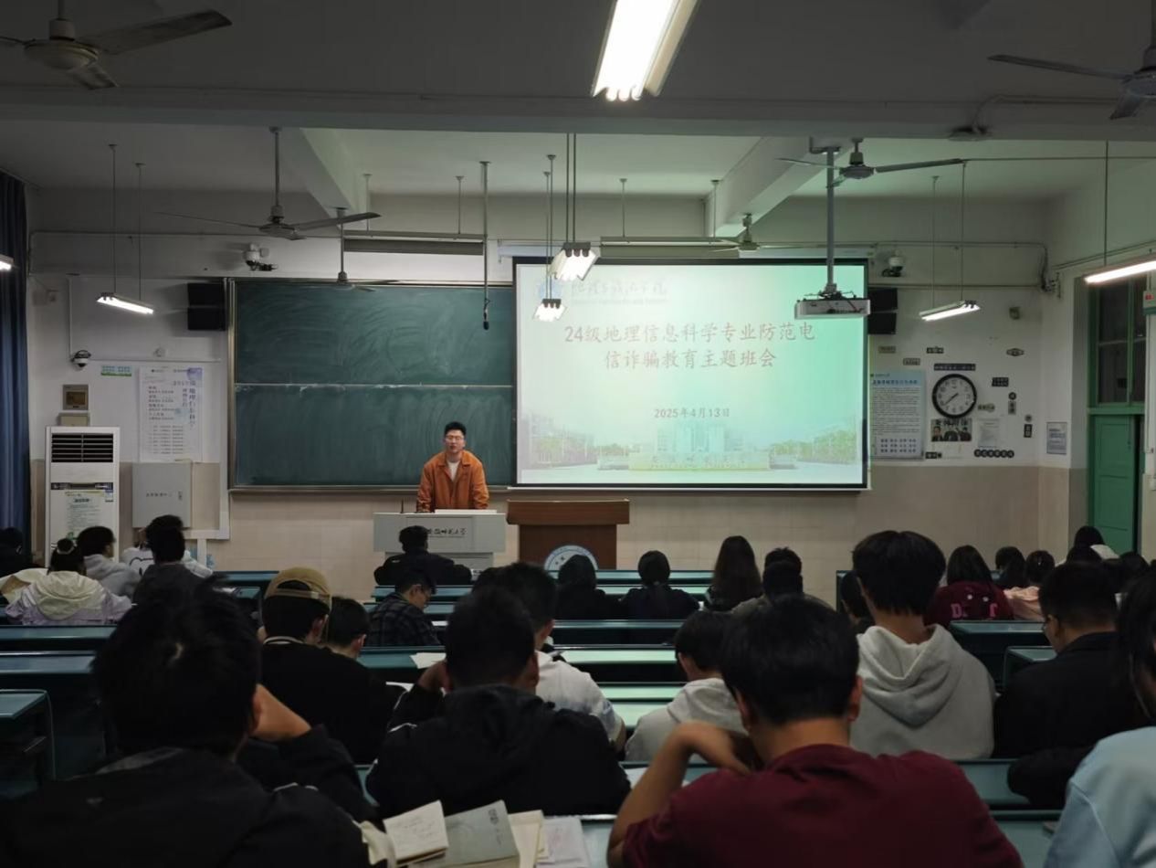 电信网络诈骗手段迭代升级,校园诈骗案件呈现高发态势。为进一步普及反诈知识,增强学生“识诈反诈”意识和能力,切实保护学生生命财产安全,预防可能存在的诈骗风险,4月13日晚,地旅学院辅导员沈涵利用24级地理信息科学专业晚自习时间召开了防电诈主题班会,24级地信专业全体同学参加本次班会。