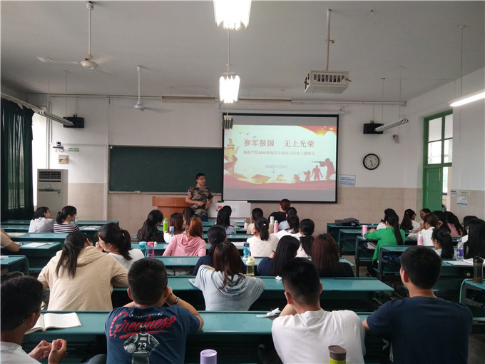 本网讯(地旅学院 周思雨)为鼓励学生积极参与应征入伍,提高兵员征集的数量与质量,增进同学们对国防知识和国家征兵入伍政策的了解。5月6日下午5点,2016级地理信息科学专业在行知楼2040501教室召开征兵宣传主题班会。会议由辅导员赵将主持,2016级地理信息科学的全体同学参加了此次班会。