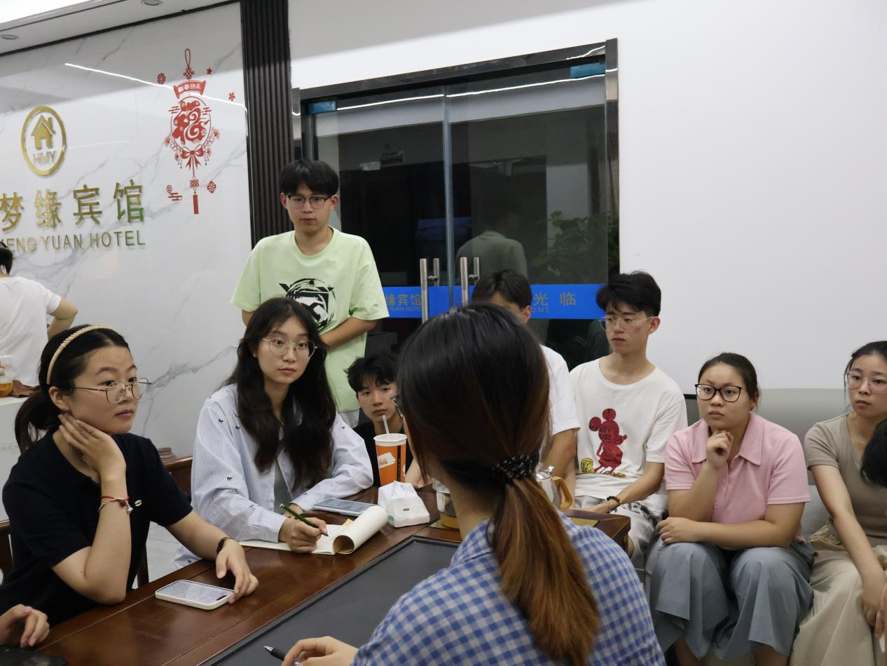 团队在抵达实践地点宾馆后,召开了第一次会议。由实践团队队长施洁对后续工作进行了简要部署,并强调了相关注意事项。