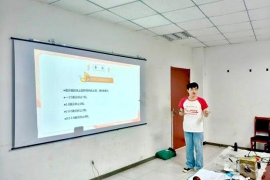 拼图活动结束后,课堂氛围转向悠扬的旋律。23级土地资源管理何俊杰同学为学生们带来了歌曲《萱草花》前半部分的教学。何俊杰耐心地教授,从识谱到逐句学唱,引导学生们感受音乐的韵律之美和其中蕴含的温情。学生们认真学习,稚嫩而认真的歌声在教室里回荡,为充实的一天增添了温馨的艺术色彩。