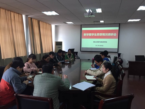 本网讯(国旅学院 刘冠琪)为贯彻落实学校《关于开展新学期学生思想情况调研工作的通知》(〔2017〕1号)文件精神,进一步加强新学期学生管理,深入倾听学子心声,3月8日下午,国旅学院召开“对话﹒成长”——新学期学生思想调研师生座谈会,根据专业属性分成地理土管、旅游酒店、地信城规三个分会场。院党委书记贾冠忠、学院院长苏勤、院党委副书记乔静、分管教学副院长方凤满、分管科研副院长王朝辉以及各专业负责人、全体辅导员、各年级学生代表参加了本次座谈会。