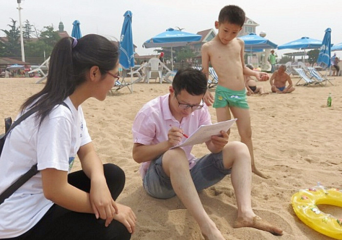 首日的活动以旅游者旅游文明认知调研为主。团队成员来到位于汇泉湾畔、享有“东亚第一海水浴场”美名的青岛市第一海水浴场,深入游客之间开展问卷调查。浴场滩平坡缓,沙滩上游客们来来往往,人头攒动。队员们为开展调研,带着问卷行走在海滩边,向游客们说明调研的原因和意义,礼貌地邀请他们填写调查问卷,了解游客们对于文明旅游的理解和对景区不文明行为的看法,掌握准确的相关数据,寻求改善旅游不文明行为的更有效途径。