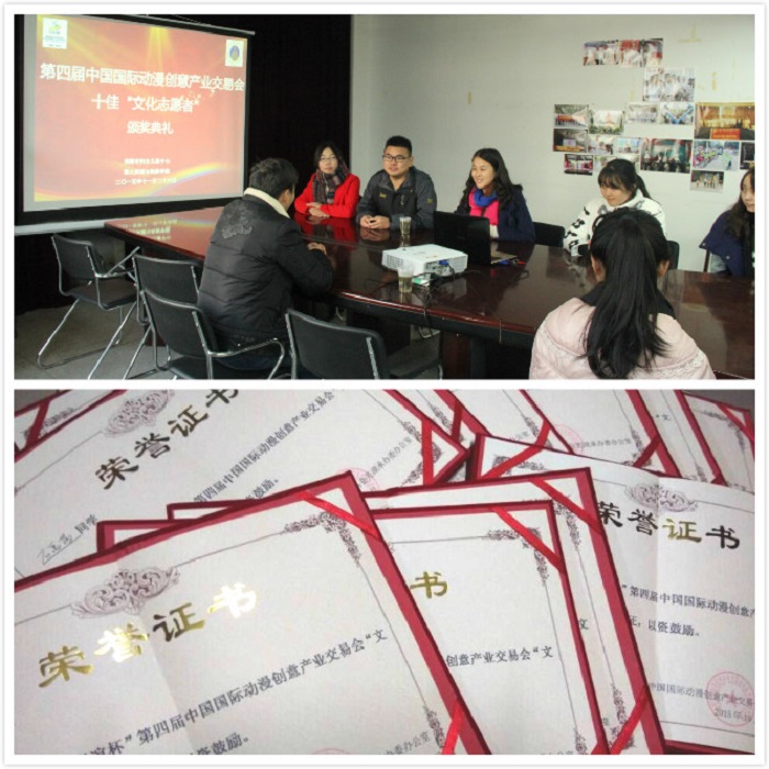 本网讯(国旅学院 王美)11月27日下午,第四届中国国际动漫创意产业交易会“十佳文化志愿者”表彰会暨志愿者证书颁发仪式在我校国旅学院举行,本次评选活动由中国国际动漫创意产业交易会组委会办公室、芜湖市文化委员会主办,芜湖市博物馆、芜湖市妇女儿童活动中心承办,共有来自我校国旅学院、体育学院、外国语学院的10名同学获此殊荣,其中国旅学院有7人入选。