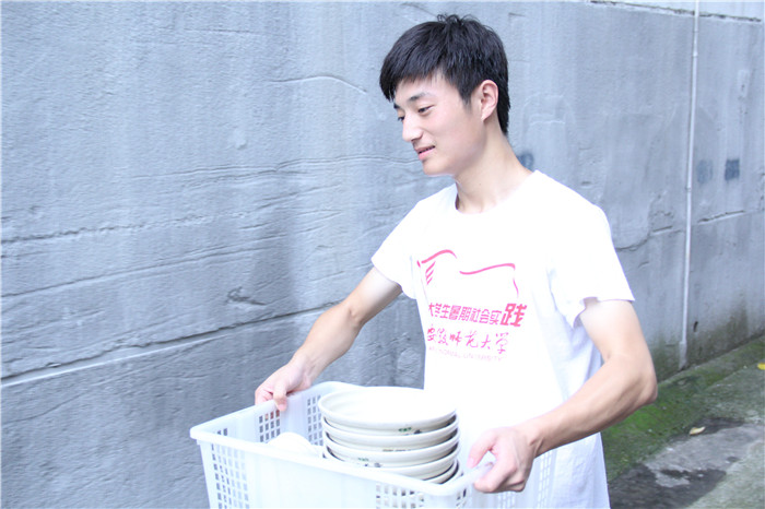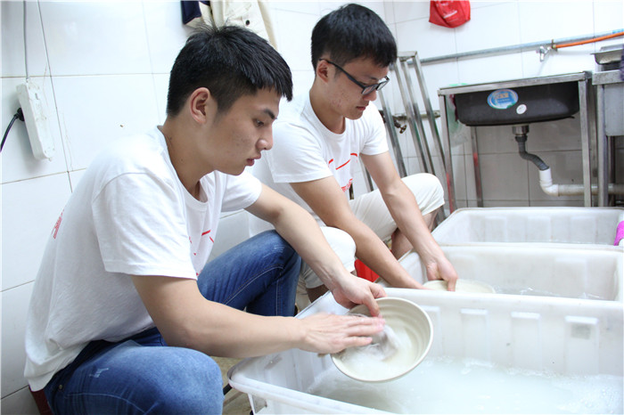 7月22日,队员们化身义工在雨花斋免费素食餐厅开始了志愿服务。队员们分成五批,分别负责打饭、洗碗、收盘子、门口礼宾和文明标语提示的工作。食客中有环卫工、有保安,在这里大家都得到真挚的友善和敬意,不仅是佛家的人人生而平等的警示戒言,也是对社会主义核心价值观中“平等”一词的诠释。“雨花斋大都是善心人士资助的,所有食材也来自社会捐助,这里的所有服务人员都是义工。大学生能来做义工,有奉献精神,为你们点赞。”负责人裘阿姨如是说。