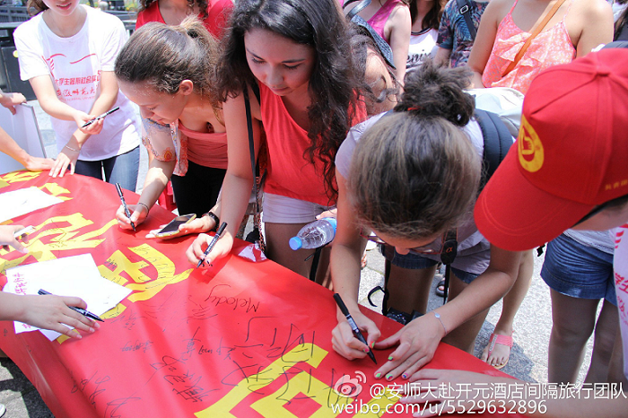 在绍兴,鲁迅故居前队员们成功举行“核心价值观,文明旅游”公益宣讲活动,用自己的热情传递青春正能量。活动还吸引了一批前来观光旅游的外国友人,他们在横幅上用中英文写下话语,传递正能量,让队员们体会到“公益无国界”。