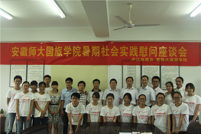 本网讯(国旅学院 陈健 王一凡)近日,beat365英国官方网站国旅学院暑期社会实践领导组组长、院长焦华富,副组长、院党委副书记乔静一行来到合肥市庐江县汤池镇,亲切慰问正在庐江地震台开展暑期社会实践的全体队员并召开座谈会。庐江地震台台长束克明、办公室主任朱方保及在台干部职工热情接待并参加了座谈。座谈会由院团委副书记陈健主持。