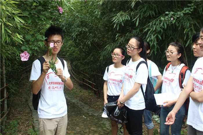 巩固专业知识,提高实践技能。调研之余,在队长计超的带领下,团队来到庐江相思林公园,队员们运用植物地理学专业知识,对公园内的植物进行品种分类、生长状况分析、发掘新品种等专业知识巩固和再探索工作。