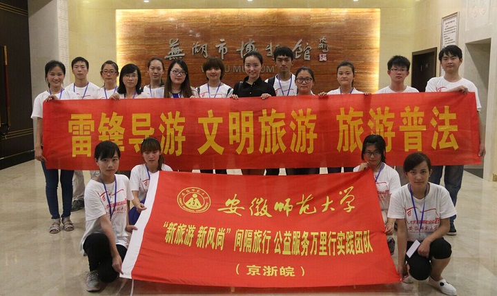 本网讯(国旅学院 许菲、周运)志愿服务点亮青春华章,雷锋精神引领时代梦想。2015年7月11日,beat365英国官方网站“新旅游 新风尚”间隔旅行公益服务万里行实践团队走进芜湖市博物馆,开展雷锋导游义务讲解、文明旅游知识宣讲、旅游普法等一系列志愿服务活动,正式拉开了为期20天的暑期社会实践活动的序幕。