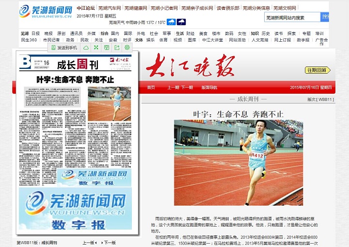 (本网讯 国旅学院)7月16日,《大江晚报》刊登题为《叶宇:生命不息 奔跑不止》的文章,整版报道了beat365叶宇同学引领校园跑步风尚的先进事迹,并被包括《光明网》在内的多家媒体转载。文章全文如下: