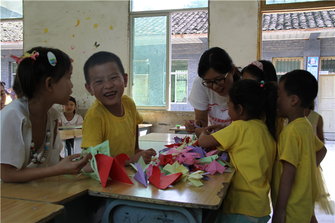 下午,志愿者们给孩子们开设了手工课,教授孩子们制作折叠爱心卡并在卡片上写上他们想说的话。“我从来没有想过他们会那么懂事,只是第一天而已,他们竟然问我明年还来不来,我真的好骄傲好自豪,这更坚定了我当初的信念。”手工课老师、来自14级环境工程的黄东君这样说道。而那一句“我希望尖山村的所有人都能幸福快乐”更是深深地触动了队员们的心房,引得大家纷纷落泪。