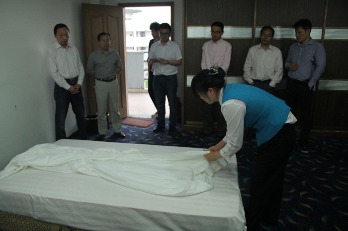 座谈会后,即将代表我校参加全国第七届旅游院校服务技能(饭店服务)大赛的四位同学,为现场的领导老师和同学奉献了一场以“饭店实操技能服务”为主题的专业技能展演,共分为中餐宴会摆台、西餐宴会摆台、中式铺床和鸡尾酒调制等四个部分。同学们扎实精湛的专业技能和新颖独特的创意设计赢得了在场老师同学们的阵阵掌声,充分展示了该院应用型专业学生良好的专业素养及实践创新能力。