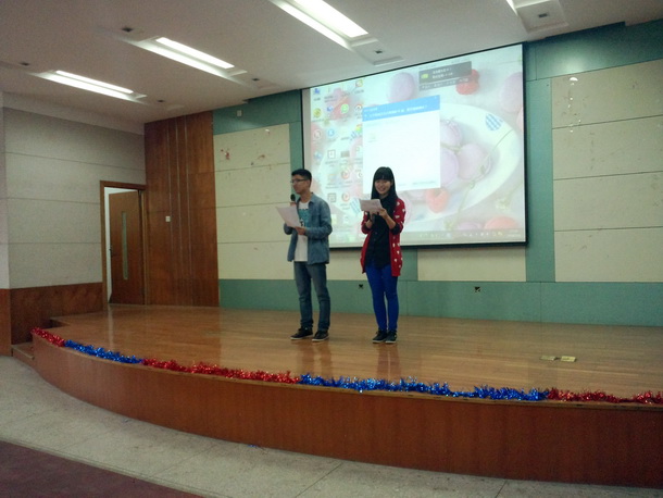 联欢会由班长姜旭、文艺委员何芳翎共同主持。在一片欢声笑语中开场后,施金鑫同学的一首原创诗朗诵《121102的我们》带着大家一起回顾了两年来从初次踏入大学校园、到第一次班级集体出游、再到皖南野外实习的点点滴滴。从指缝中溜走的那些日子在他饱含深情的朗诵中再度鲜活起来。而后,贾佳同学一曲热情洋溢的英文版《吻别》使现场的气氛迅速回温。他凭借毫不怯场的演唱以及与台下同学们的频繁互动赢得了全体同学的热烈掌声。节目之间穿插的各种趣味游戏制造了一个又一个的高潮,特别是同学们用各自的家乡话为经典影片配音环节,南腔北调齐聚一堂,其乐无穷。而当晚最大的惊喜莫过于本班远在韩国世宗大学交换学习的刘迎晨同学特别为大家录制的视频,她在视频中表达了对同学们的思念和对未来的美好祝愿,这份情谊在这即将分别的时刻尤为珍贵。虽然天各一方,但是在大家的内心,我们从未分开。