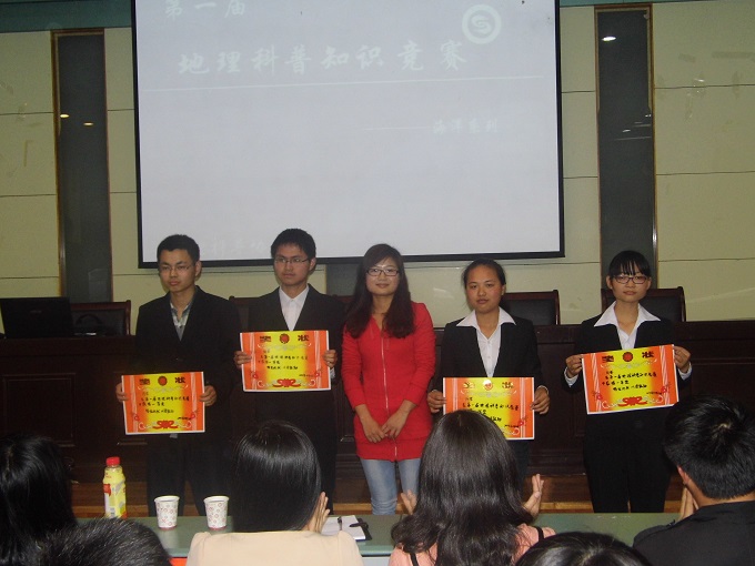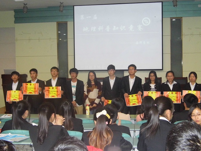 精彩而激烈的比赛在主持人热情洋溢的开场词中正式拉开帷幕。竞赛共分为个人题、小组题、分组题和终极抢答四个环节,用PPT的形式展示题目,并由主持人读题。经过抽签分组的六支队伍各显本领,慧智囊中,展现了各自广阔的知识面,台下观众掌声连连,赛场气氛热烈高涨。在中场休息时间,面向观众的有奖互动和协会精心安排的歌曲对唱,也为紧张的比赛增添了轻松与乐趣。经过公平公正的层层筛选,“蓝色梦之队”与“深海之星队”两组队伍进入最后的抢答环节。抢答环节更是将现场的气氛推向高潮,两组比分不断攀升。最终,蓝色梦之队更胜一筹,斩获桂冠,其他队伍分获二、三等奖。