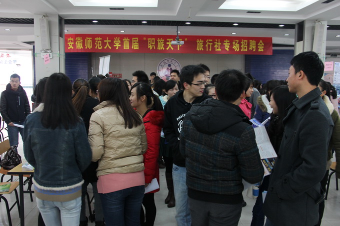 此次宣讲招聘会分为企业宣讲和招聘两个环节。会议开始,各著名旅游企业单位代表通过播放宣传片,PPT等方式生动全面地展示了各公司情况。其中安徽环球国旅的徐华玉总经理以“带着理想做旅游”为主题给在场大学生带去了精彩的演讲,分别从我国旅游业的现状、环球国旅企业的发展以及就如何成为旅游人才等方面为大家勾勒了美好的职业蓝图。随后携程旅行网、芜湖国游旅行社、芜湖商会旅行社有限公司等企业代表也纷纷上台进行宣讲,激扬的话语点燃了在场每一位毕业生的希望与热情。在随后的互动提问环节中,毕业生就岗位选择选择、就业心态、职业发展等问题进行咨询,各企业代表认真作答,并鼓励大家要审视行业、脚踏实地、积累资本。