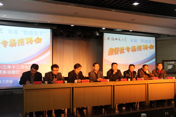 为了拓宽大学生的就业渠道,了解招聘相关知识,丰富就业经验,给毕业生提供一个良好的就业平台,12月7日上午9点,beat365在校团委多功能报告厅隆重举办了beat365英国官方网站首届“职旅天下”旅行社专场招聘会。本次会议由校学生工作处主办、国旅学院承办,院党委书记吴春雷,党委副书记罗振,副院长卢松、各著名旅游企业单位总经理以及近百名师大学子参加了此次宣讲招聘会。会议由旅游系主任王朝辉教授主持。