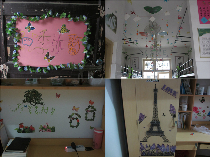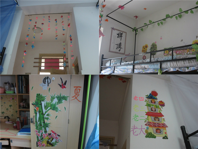 同学们利用自己的艺术特长在一个多月的时间里精心策划,认真准备。他们围绕“青春住我家,和谐满校园”的主题,尽量减少花费,自己动手画、缝、剪、折、贴,创意新颖、构思精妙,寝室变得或清爽、或温暖、或梦幻、或动漫、或环保、或生动、或自然……,设计风格多种多样,真可谓是八仙过海,各显神通。有的装饰物是学生们自己制作,像照片墙,心愿墙。像硬皮纸改造的摆放台,矿泉水瓶盖成为墙上的饰物,废盒子改造成卫生纸等地方的设计还充分融入了环保的理念。不管设计风格多么不同,但每个寝室都温馨幸福,都充满了家的气息,表现出同学们以寝室为家,勤俭持家,团结互助的情结,并表现出了一定的专业素养和审美情趣。这些都展示了学生们的创造力和想象力。