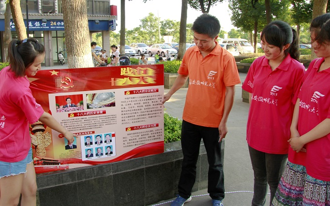 在系统自学了解了十八大精神之后,队员们各抒己见,畅谈学习十八大精神的收获和感想,并将学习的成果固化为一张张制作精美的展板,带进社区,广泛宣讲,以实际行动向党的十八大献礼。