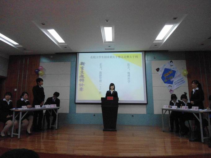 晚7点,决赛正式开始,四支代表队分别就“顺境还是逆境更有利于人的成长”和“在校大学生创业利大于弊还是弊大于利”展开激烈角逐。双方一辩都用具有高度概括性的陈述为本场辩论开篇立论,他们声如洪钟,气势澎湃。随后的攻辩环节和自由辩论环节更是将比赛一步步推向高潮,辩手们越战越勇,热情高涨。比赛进行的如火如荼。最后的总结陈词环节,双方四辩针对对手逻辑上的漏洞逐一回击,为获取胜利做最后的一搏。他们用自己的精彩表现为观众带来了一场丰富的视听盛宴。经过公正的评审,最终,2011级地理科学专业代表队获得了此次大赛的冠军。