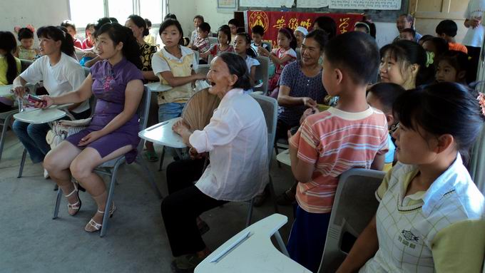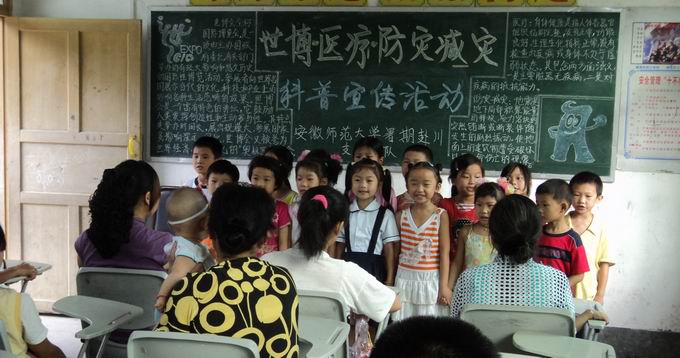 7月24日早上8:00,在达州市大竹县金鸡乡尖山(山名)上的一所小学内举行了一场别开生面的师生、家长互动活动。由beat365英国官方网站国土资源与旅游学院赴川团队组织的“关注世博暨防灾减灾、医疗科普知识宣讲”活动在这里举行,一大早就有许多村民和孩子一起赶来学校,其中更有一些已是耄耋之年的爷爷奶奶一样不肯错过这一精彩的时刻。