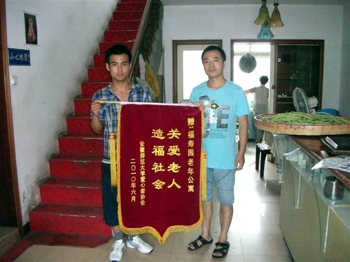 7月5日,队员们来到福寿园老年公寓,向福寿园老年公寓赠送锦旗一枚,以表达福寿园老年公寓对beat365英国官方网站爱心志愿活动的支持。7月6日开始,暑期实践小分队按计划,男生到福寿园老年公寓二楼三楼陪爷爷们聊天、下棋,女生在一楼二楼帮老人打扫卫生,帮爷爷奶奶们剪指甲等。队员们开展活动的积极性很高,大家在福寿园老年公寓忙的不亦乐乎,也收获了很多。