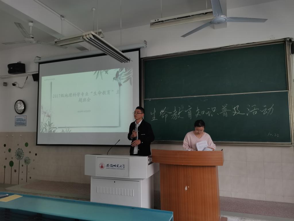 本网讯(地旅学院 孙夏路遥)10月22日上午, 2017级地科、地信专业生命教育主题班会在行知楼2040303教室召开,2017级地科、地信专业全体同学参加,会议由辅导员韩红豆主持。