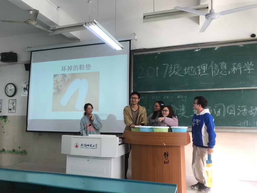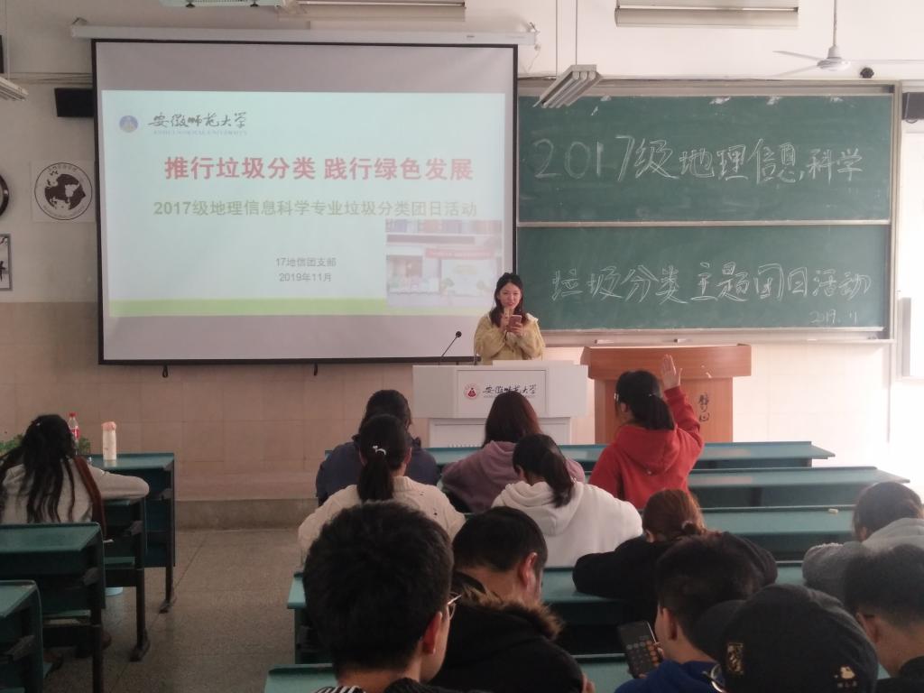 本网讯(地旅学院 章莹莹)为了推行垃圾分类,提高同学们的环保意识,2017级地理信息科学专业于11月21日下午14点在行知楼2040201组织召开了“推行垃圾分类,践行绿色发展”的垃圾分类主题团日活动。会议由团支书谢煜欣主持,该班级全体同学参与。
