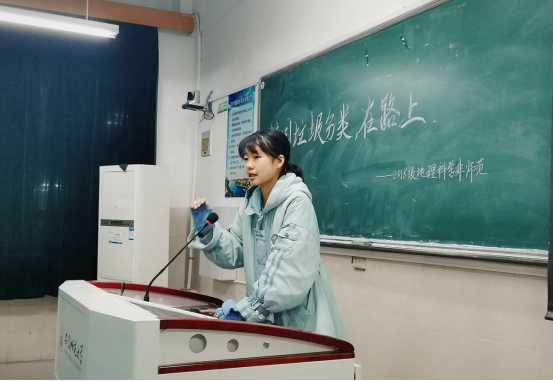本网讯(文/李娜 图/王蕾)2019年12月5日晚上七点,2018级地理科学(非师范)专业“校园垃圾分类,在路上”主题活动在行知楼2030404教室顺利举行。活动由班级宣传委员李娜主持,2018级地理科学(非师范)专业全体同学参加。