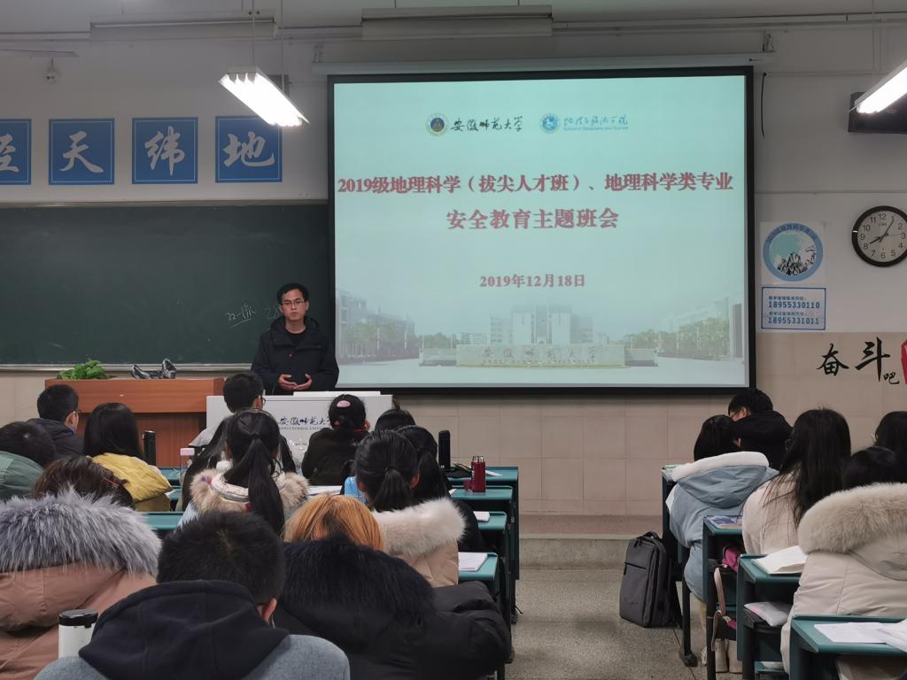本网讯(地旅学院 江文萱 齐小学)12月18日晚,2019级地理科学大类在行知楼2040104、2040501教室召开安全教育主题班会,2019级地理科学(拔尖人才班)、2019级地理科学类专业全体同学参加班会。班会由辅导员齐小学主持。