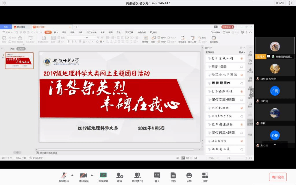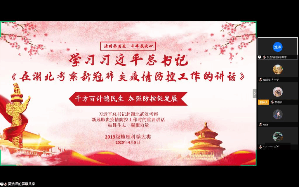 本网讯(地旅学院 武诺 齐小学)为纪念抗疫牺牲烈士和逝世同胞,学习和发扬伟大抗疫精神。4月5日晚,2019级地理科学大类利用腾讯会议网络平台举行了“清明祭英烈、丰碑在我心”网上主题团日活动。2019级地理科学大类专业辅导员齐小学应邀出席活动。2019级地理科学(拔尖人才班)、地理科学类1班和地理科学类2班全体学生参加活动。活动由2019级地理科学(拔尖人才班)班长樊敬贤主持。