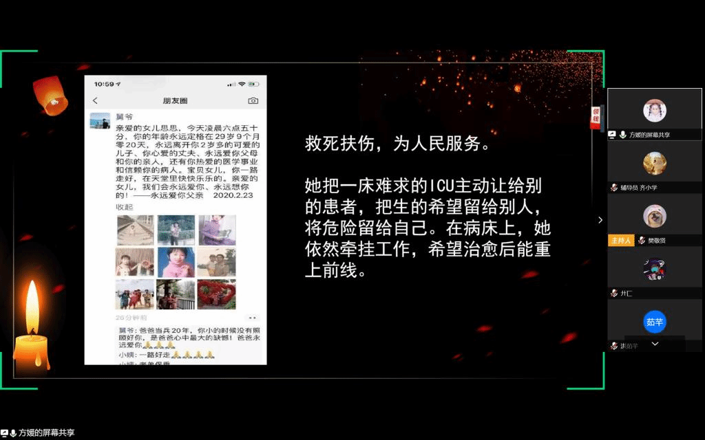 首先,2019级地理科学(拔尖人才班)团支书方媛播放了一段中国抗疫励志视频短片,展示了医护人员、军人、基层工作人员等广大人民群众在新冠肺炎疫情爆发后做出的伟大贡献。其中以李文亮、刘智明、夏思思等十四位一线抗疫牺牲烈士为代表的医护工作者勇做逆行者,冲锋在前,在没有硝烟的战场上救死扶伤,为我们驱散疫情阴霾。