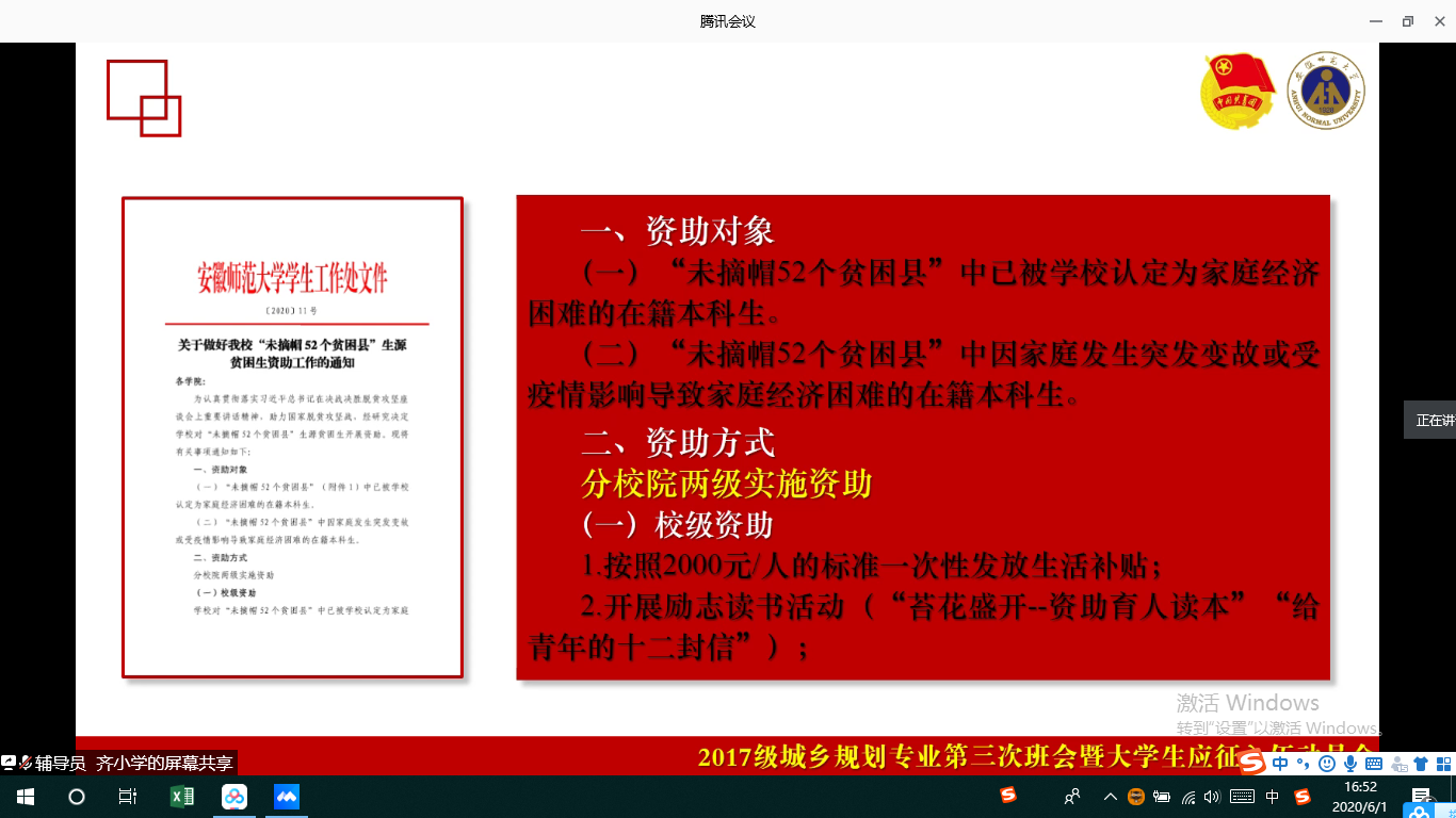 接着,齐小学解读分析了学校《关于做好我校“未摘帽52个贫困县”生源贫困生资助工作的通知》文件。他强调,为打好我国脱贫攻坚战与疫情防控阻击战,学校对“未摘帽52个贫困县”的家庭经济困难的学生和符合认定条件需要补充认定的学生,分校院两级通过“双扶”资助育人项目、个性化结对帮扶等方式实施资助,有效缓解了家庭经济困难学生的经济压力,体现了学校对上述学生的关心关怀关爱,助力脱贫攻坚和全面建成小康社会的伟大事业。